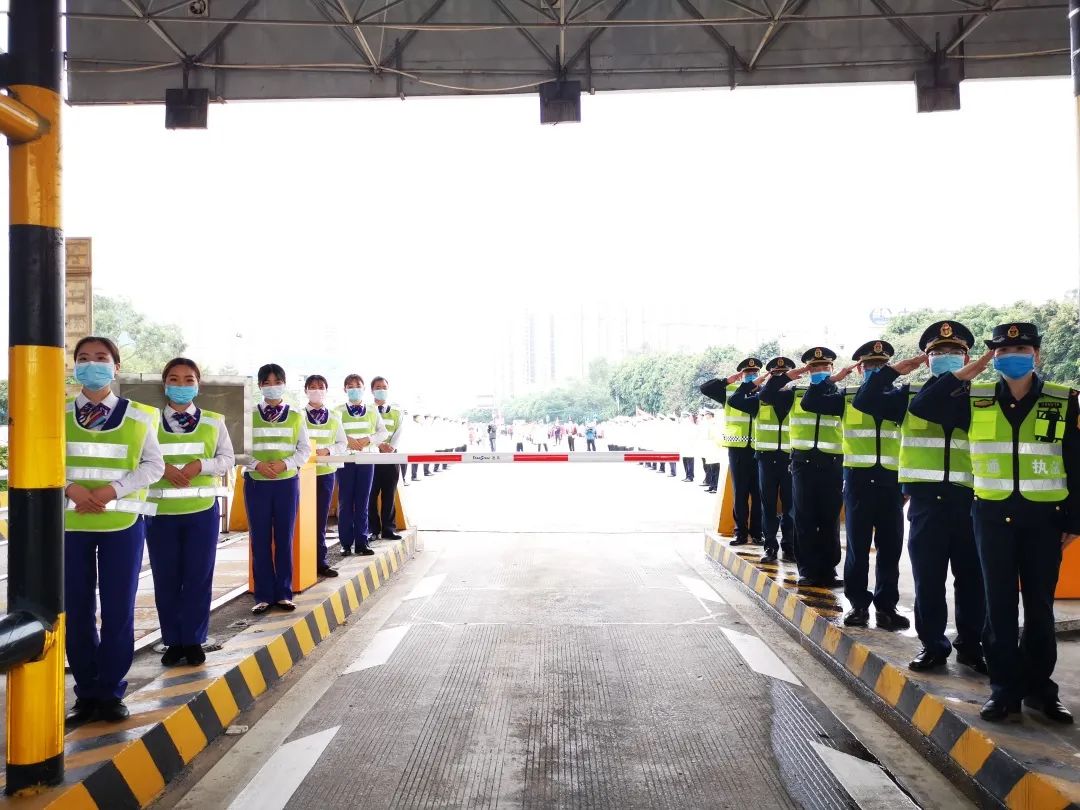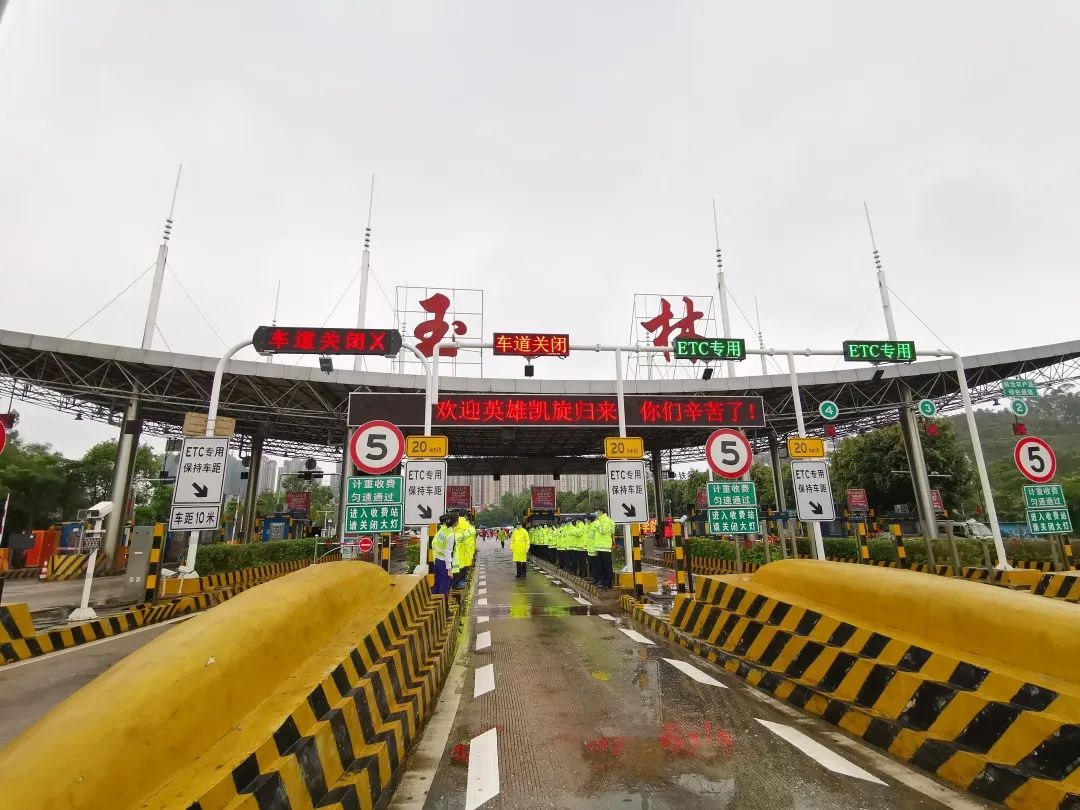 當(dāng)日下午6點(diǎn),抗疫英雄在警車護(hù)送下,乘坐大巴順利通過(guò)玉林收費(fèi)站。岑興公司收費(fèi)員、路政員以及現(xiàn)場(chǎng)所有列隊(duì)歡迎的群眾,紛紛揮動(dòng)手中的紅旗,向醫(yī)療隊(duì)英雄揮手致敬,歡迎英雄歸來(lái)。