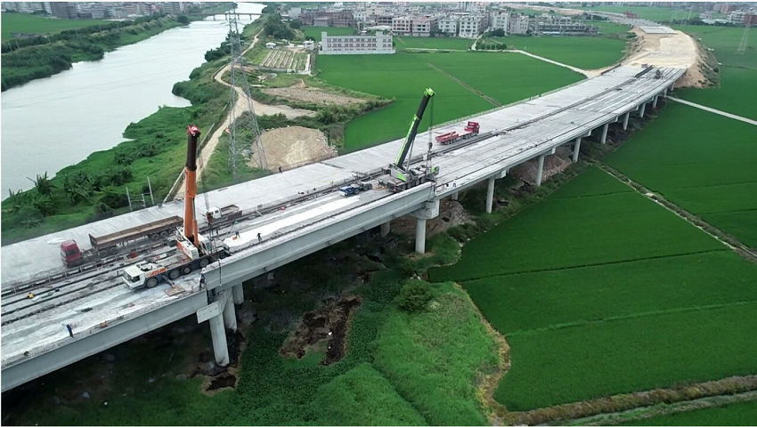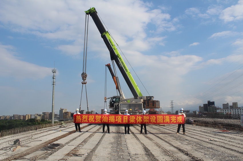 汕揭項目共計架梁2258片,其中箱梁2066片,T梁140片,空心板52片;預制梁分為箱梁、T梁,現已全部完成架設。港后練江特大橋梁體架設的順利完成,比預定節點目標提前了一天,實現了01標全線的貫通,對于正在搶工期大干的汕揭項目注入了一劑強心劑,對于全線通車具有至關重要作用。