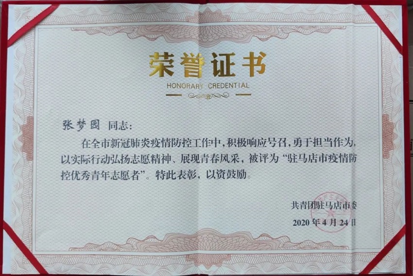 平正公司團工委榮獲“駐馬店市五四紅旗團委”稱號,辦公室(黨群辦公室)綜合干事張夢園榮獲“駐馬店市疫情防控優(yōu)秀青年志愿者”稱號。
