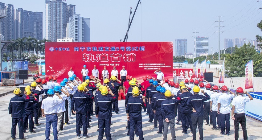 9月1日10時10分,在南寧地鐵5號線02標工程機電9工區(qū)金橋客運站鋪軌基地,軌道首鋪儀式現(xiàn)場彩旗飄揚,隨著“開始鋪軌”一聲令下,一節(jié)25m軌排被龍門吊穩(wěn)穩(wěn)吊起,緩緩下降安放至隧道內,標志著南寧地鐵5號線02標工程正式進入鋪軌大干熱潮。