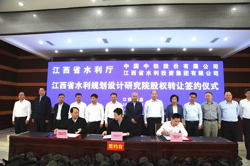 9月28日上午,中國中鐵與江西省水利廳在南昌簽署江西省水利規劃設計研究院股權轉讓協議。中國中鐵黨委副書記、總裁陳云出席簽約儀式并致辭,江西省副省長、江西省水利廳黨委書記、廳長羅小云出席簽約儀式并講話。中國中鐵副總裁、總法律顧問于騰群代表中國中鐵分別與江西省水利廳副廳長、江西省鄱建辦主任羅傳彬及江西省水利投資集團有限公司黨委書記、董事長謝德強簽署有關股權轉讓協議及股東協議。股份公司規劃發展部部長張學軍,股份公司財務與金融管理部部長李平,集團公司黨委書記、董事長龍援青,集團公司黨委副書記、總經理譚世俊出席簽約儀式并見證簽約。