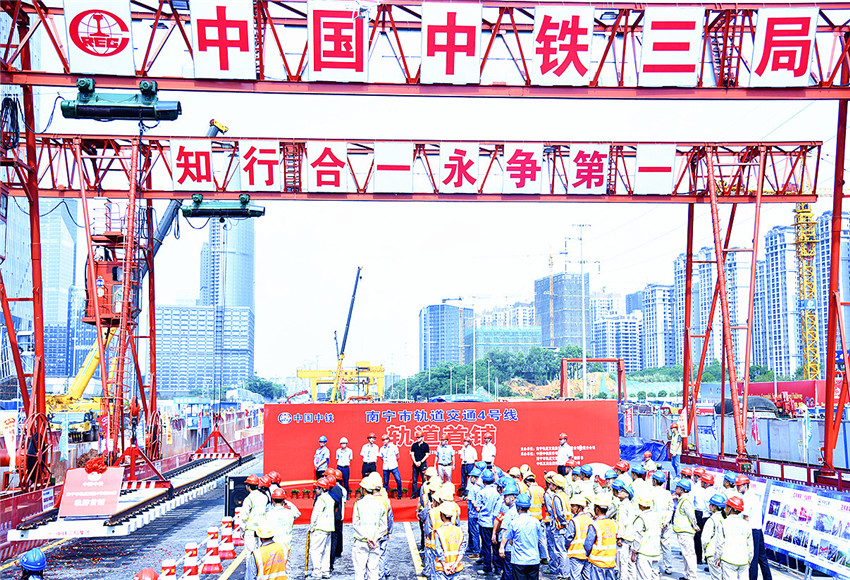 在2020年國慶中秋“雙節”假期,中國中鐵充分發揮大兵團作戰優勢,號召南寧地鐵4號線、5號線的“鐵軍”,集中資源精力向保通車目標發起沖鋒,組織百人會戰大沙田、千人攻堅戰,用1個月時間完成3個月工程量,創下了全國領先的“南寧速度”和“南寧效率”,按期實現了竣工預驗收及運營前安全評估工作,為南寧地鐵4號線開通印上了中國中鐵勇于跨越、追求卓越的“鐵軍精神”。