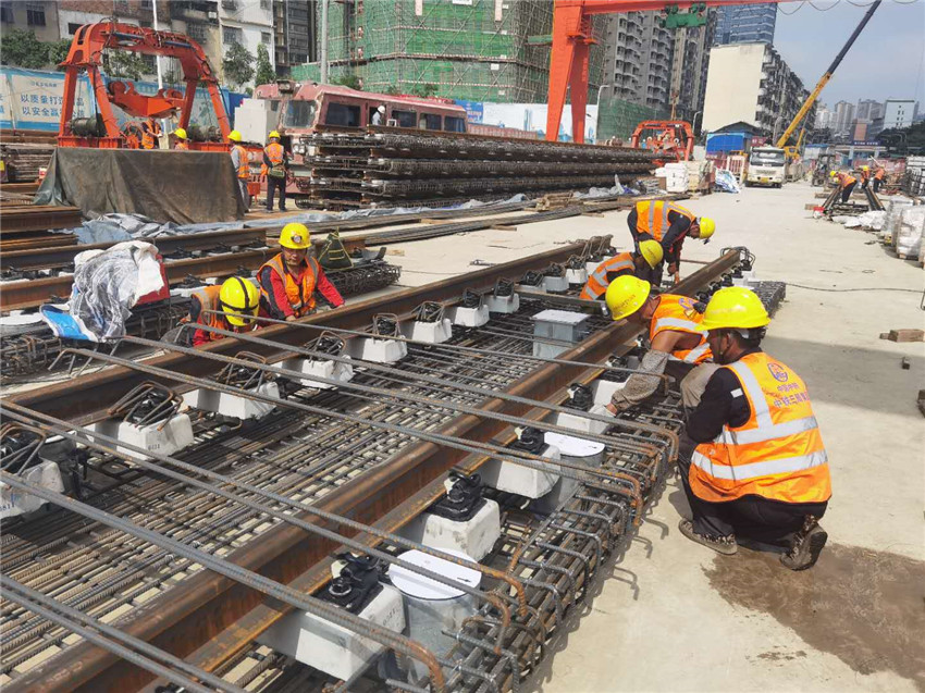 南寧地鐵5號線02標鋪軌工區自2020年9月1日開工以來,面臨施工時間緊、場地交叉移交難度大、作業面移交滯后、施工面狹小、軌行區多單位交叉施工管理困難等不利因素,鋼彈簧浮置板道床、減振墊浮置板道床施工范圍分散等復雜施工工藝難題,指揮部精心組織,積極與業主、工區、設計、監理等單位協調溝通,嚴格貫徹“四化一綠”“六專”等理念,掀起“決戰四季度、決勝保目標”專項勞動競賽大干熱潮,通過調整資源配置,優化施工工藝,提前一周圓滿實現了雙線短軌通重大節點目標。