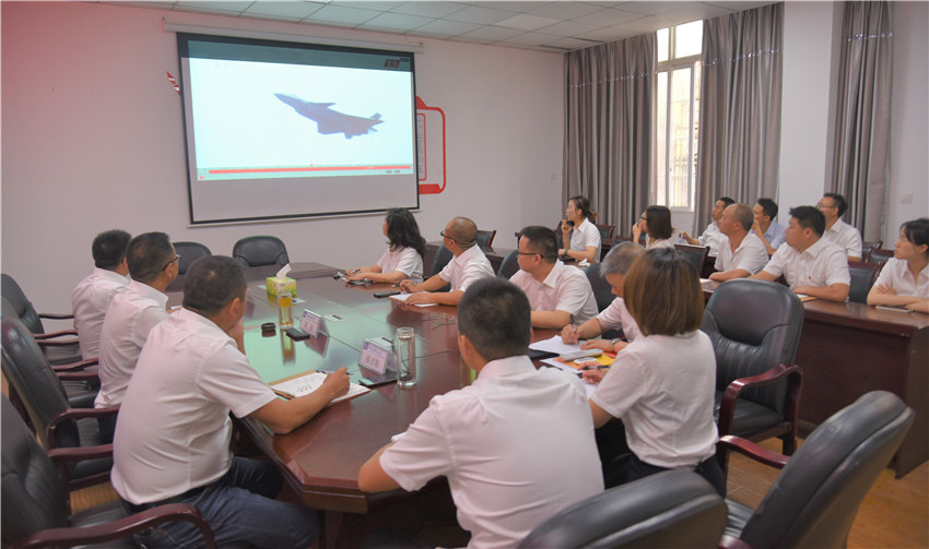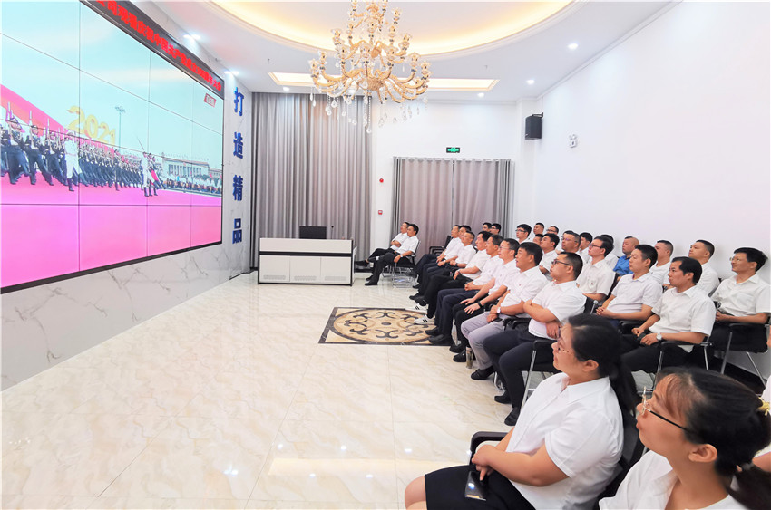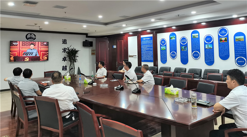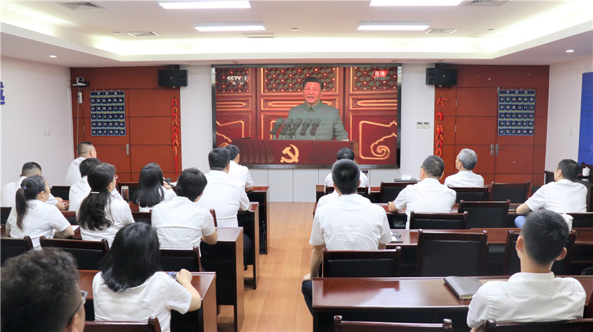 ▲集團公司黨委副書記(主持工作)、副董事長(主持工作)譚世俊,集團公司黨委副書記、總經理李建光及其他在家領導班子成員與機關本部全體人員共同觀看大會直播