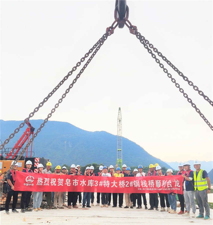 7月16日下午17時,隨著最后一塊鋼筋混凝土預制板鋪設完成,爐慈高速公路項目皂市水庫3#特大橋2#鋼棧橋順利合龍,標志著3#特大橋施工建設即將全面啟動。