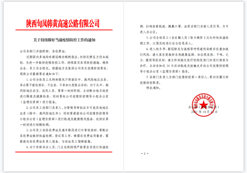 10月17日以來,國內出現多點散發本土疫情,呈快速發展態勢,目前已波及12個省區市,感染者大多有跨地區旅游活動,疫情進一步擴散風險仍在加大,對此,全公司所屬各單位積極按照集團公司疫情防控安排部署,迅速行動,筑牢疫情防控安全防線。