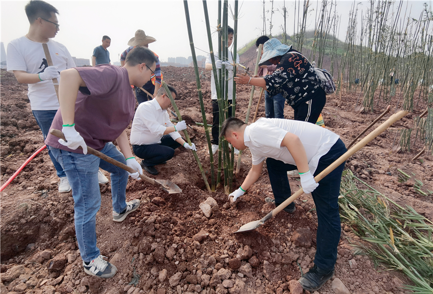 活動現場,全體青年集中學習了習近平總書記關于“綠水青山就是金山銀山”的理念,并在園藝老師的指導下,經過竹槽開挖、竹形修理、竹根上藥、竹苗施肥、竹槽回填、竹苗澆水等流程,共同完成了20余株巨黃竹栽種。
